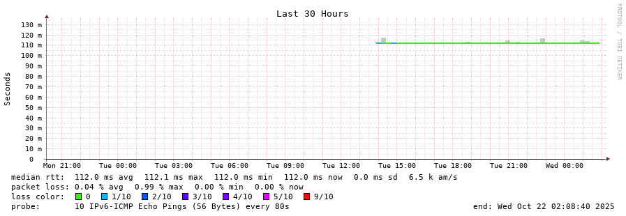 traceroute to 2a0c:9a40:8610:e3f::1 (2a0c:9a40:8610:e3f::1), 30 hops max, 80 byte packets - Generated at 2025-10-22 01:00:01