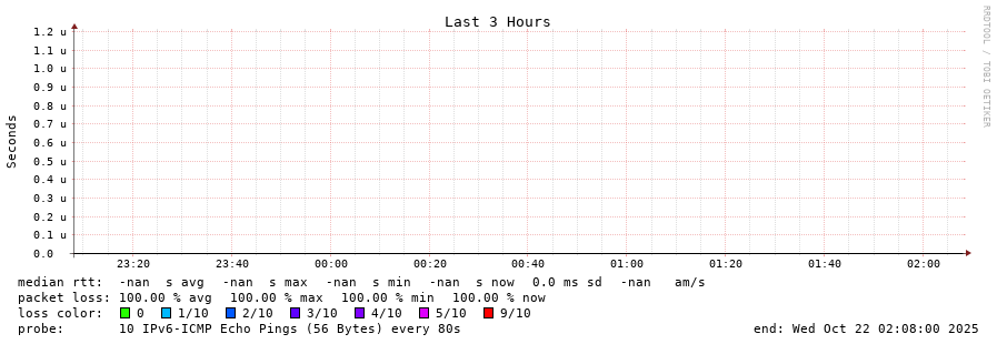 traceroute to fd9b:f75:a3d5::2 (fd9b:f75:a3d5::2), 30 hops max, 80 byte packets - Generated at 2025-10-21 20:30:02 3 > 4 > 5 > 6 > 7 > 8 > 9 > 10 > 11 > 12 > 13 > 14 > 15 > 16 > 17 > 18 > 19 > 20 > 21 > 22 > 23 > 24 > 25 > 26 > 27 > 28 > 29 > 30 >