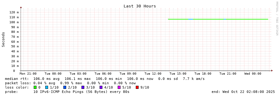 traceroute to 2a00:c30:bbbb:d::2 (2a00:c30:bbbb:d::2), 30 hops max, 80 byte packets - Generated at 2025-10-21 20:30:02